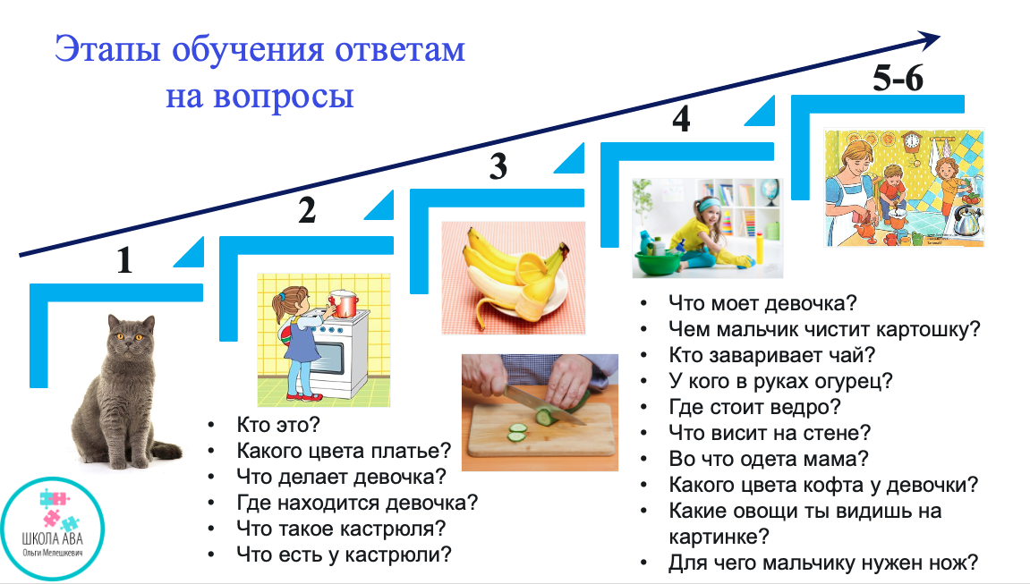 6 последовательных этапов, на которых ребёнок учится отвечать на вопросы по картинке и без неё, увеличивая длину вопросов и ответов.